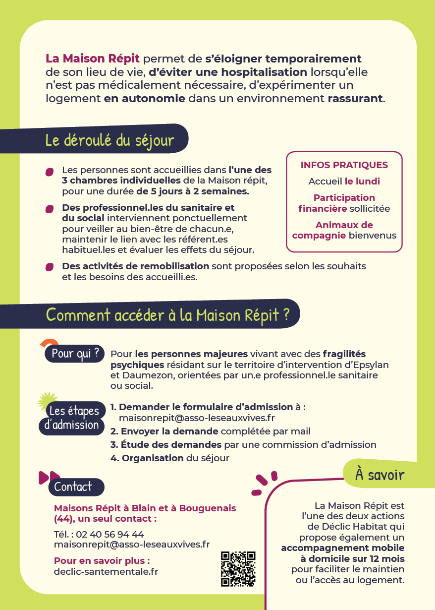 La Maison Répit permet de s’éloigner temporairement de son lieu de vie, d’éviter une hospitalisation lorsqu’elle n’est pas médicalement nécessaire, d’expérimenter un logement en autonomie dans un environnement rassurant